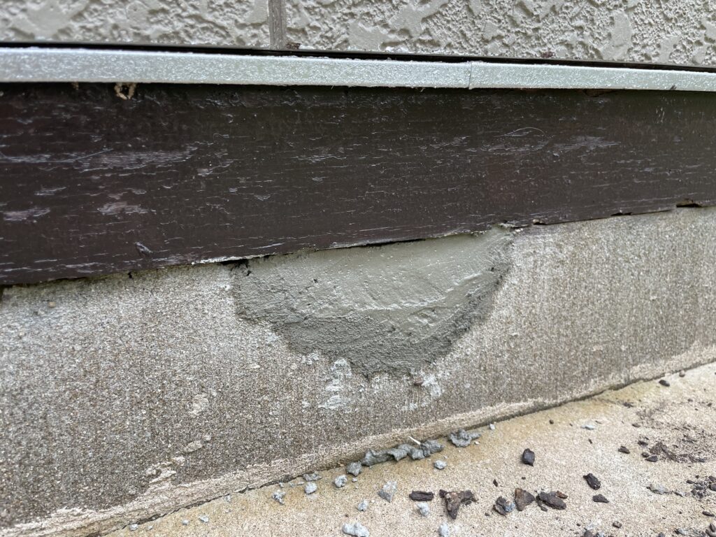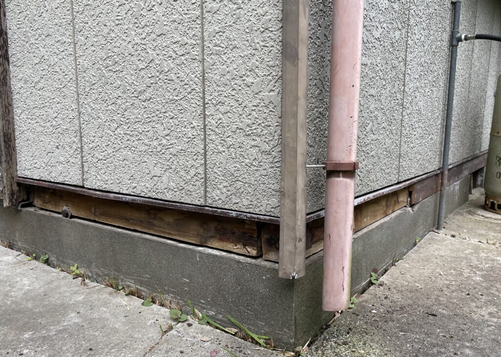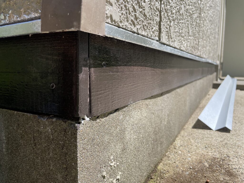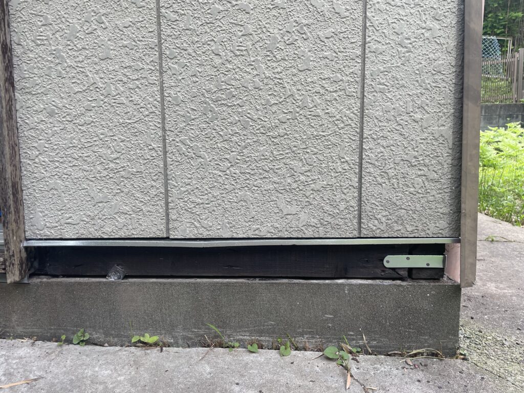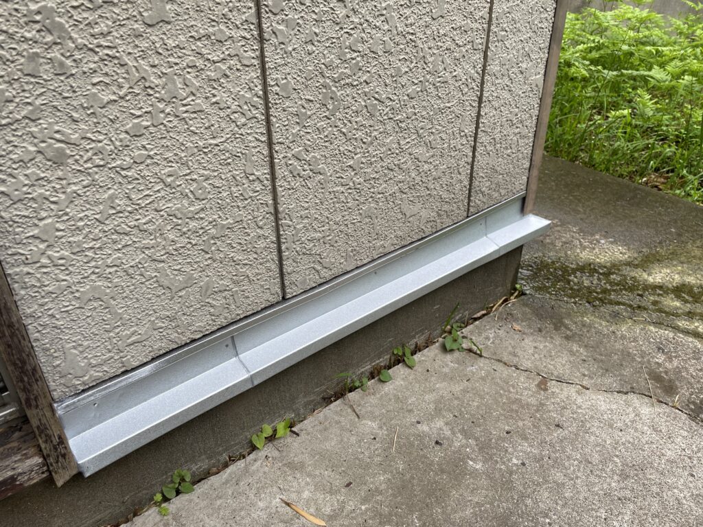 家の修繕 家の基礎と土台に雨水の浸水。 2025-06-12 4 コメント 土台水切が小さいので、基礎と土台に雨水が入り込み土台が腐食してます。 土台水切(銀色の部分)と土台カバーにペンキを塗りました。 欠損した土台は、耐水モルタルにて補修しました。 腐食した土台と土台カバーは、新しい木材にて補修しました。 土台の角部分に金物を取り付けます。 上から新しく土台カバーと土台水切(ガルバリウム製)を施工しました。 こちらのドアも補修必要ですね。 土台水切(銀色の金物)壁を、伝わって落ちてきた雨水を。家の外に排水します。